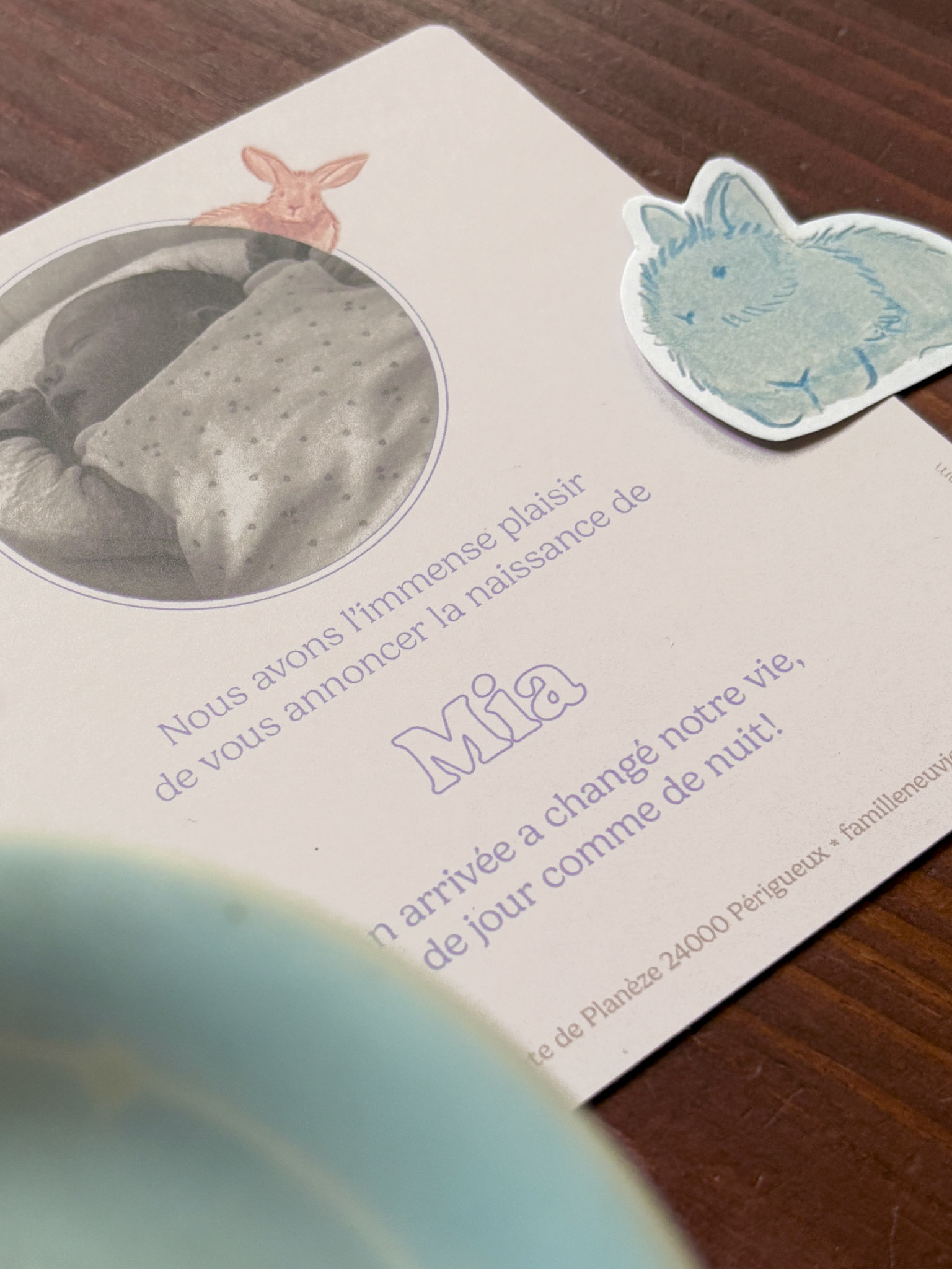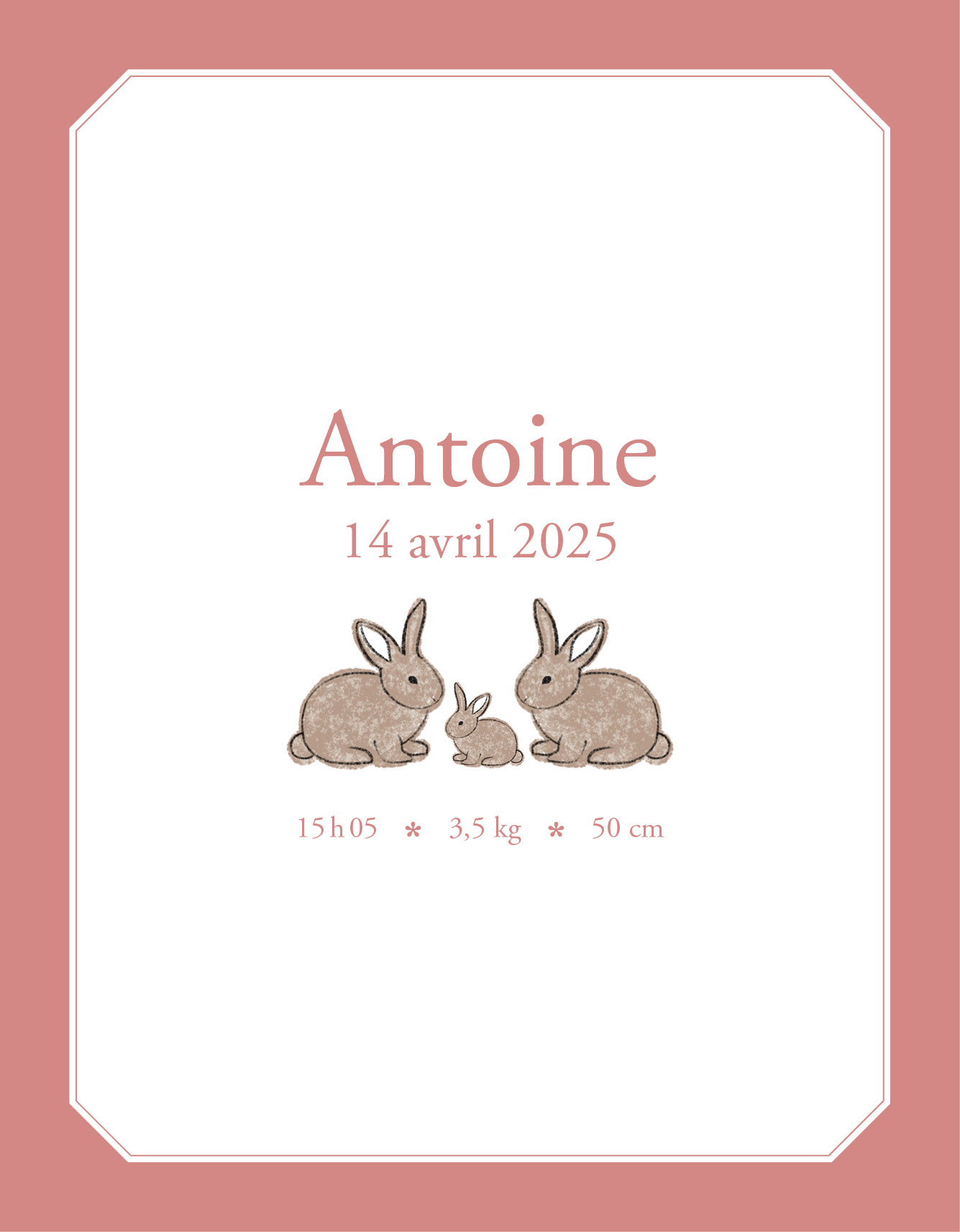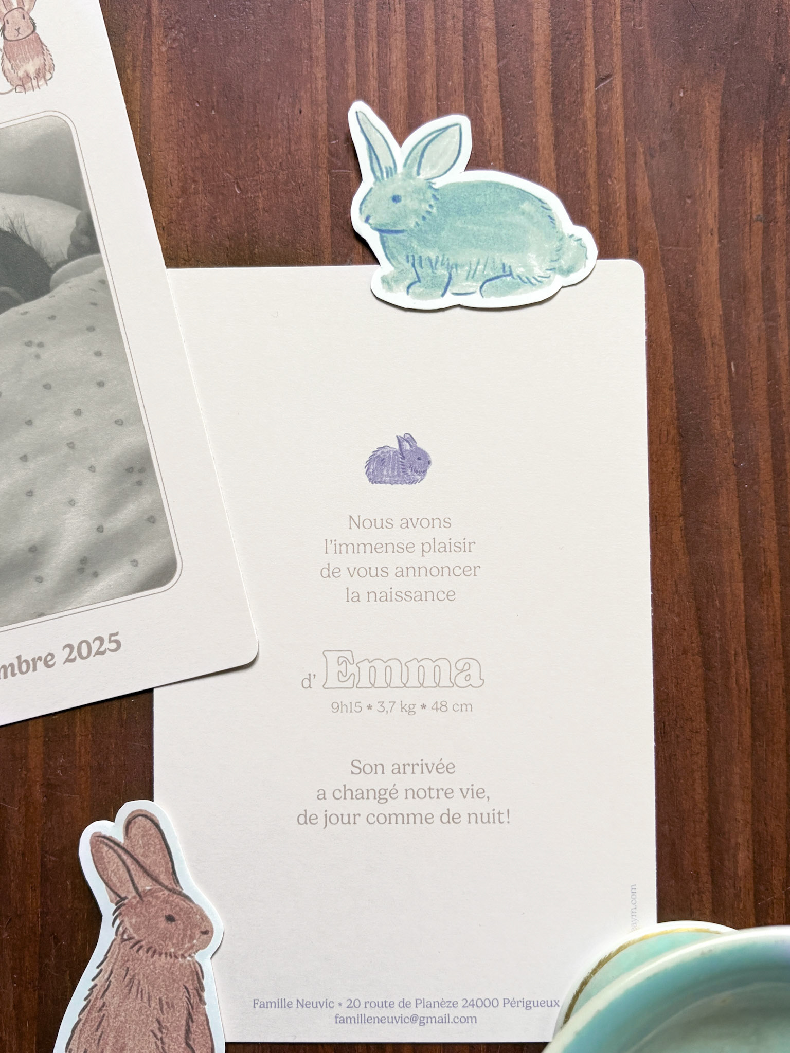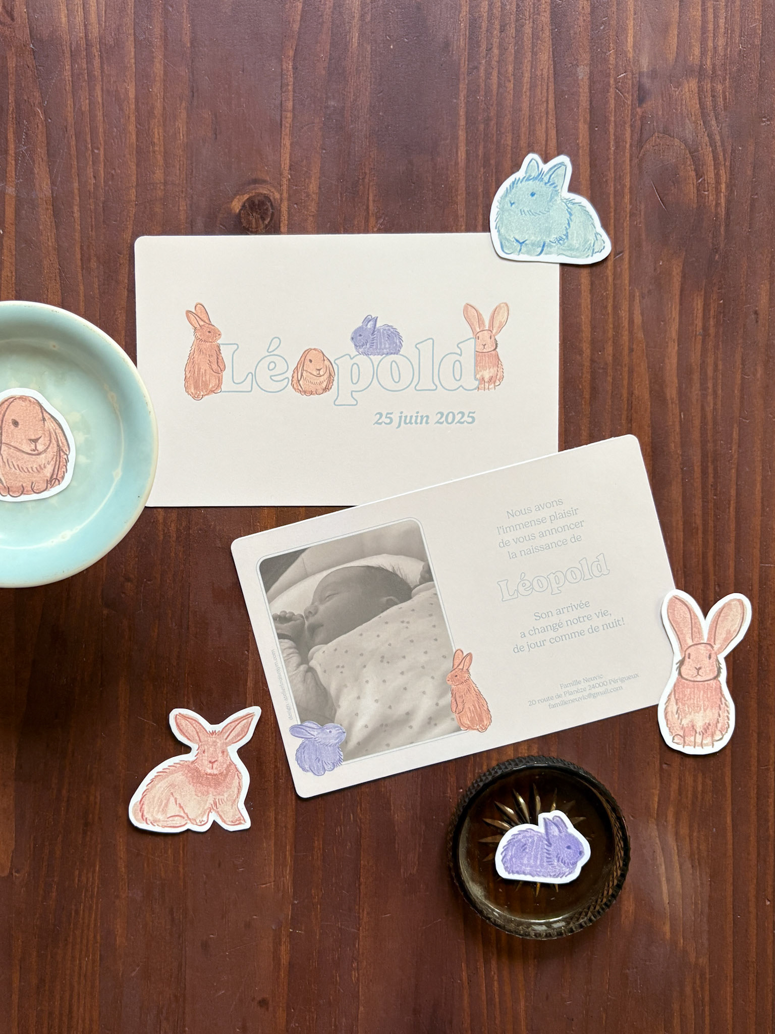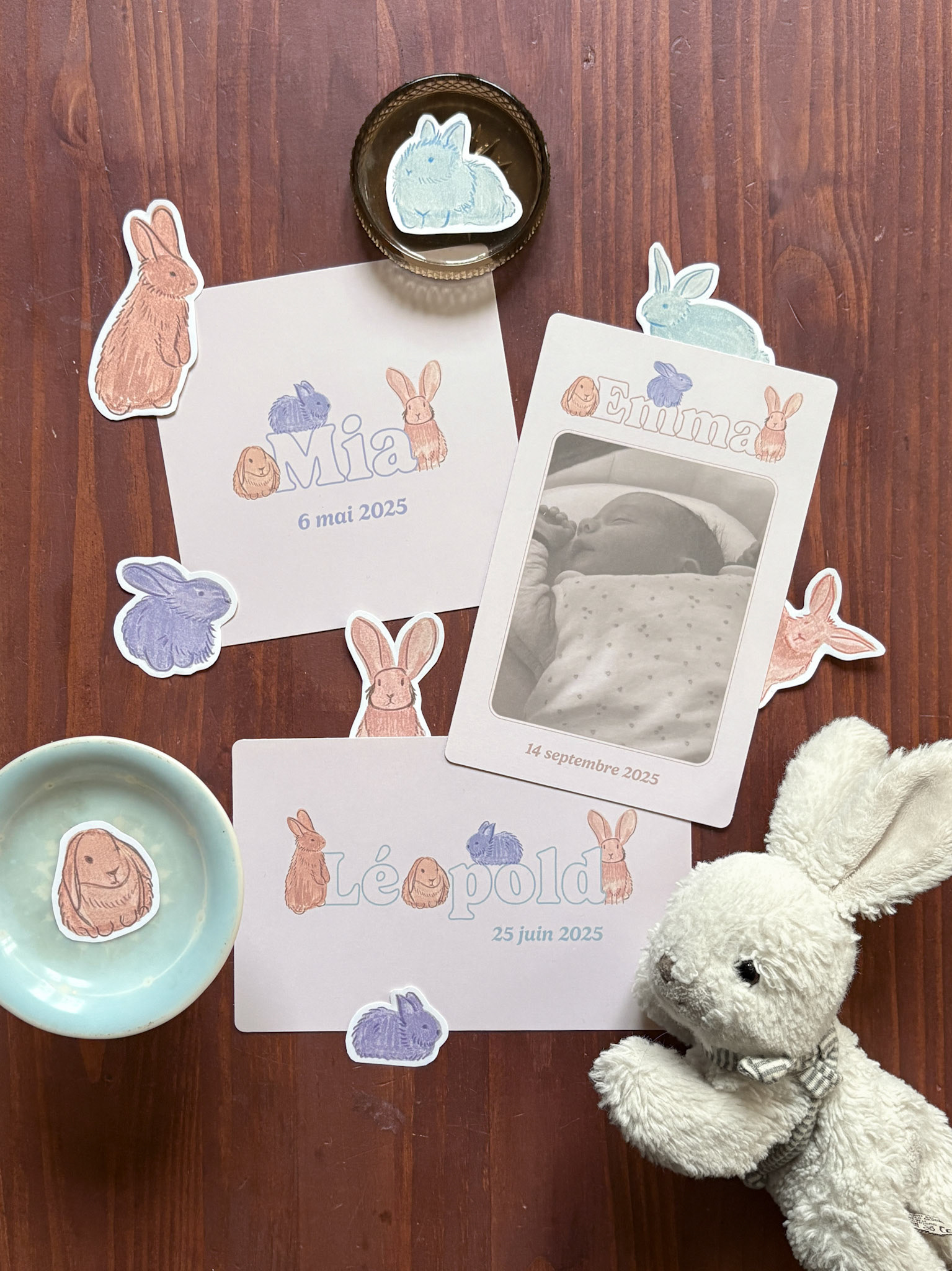 D’adorables lapins et une belle teinte terracota pour un faire-part attendrissant et chaleureux.