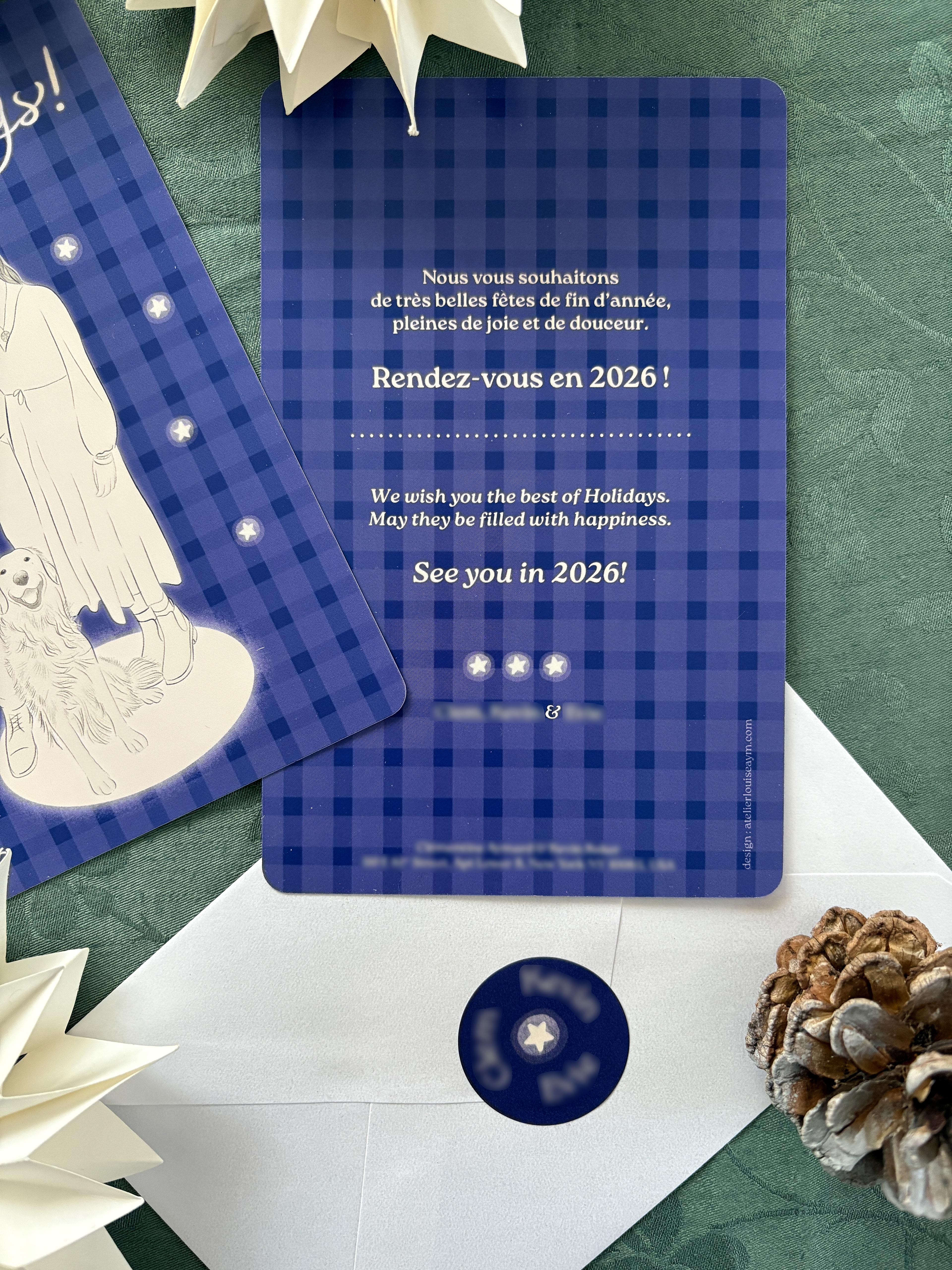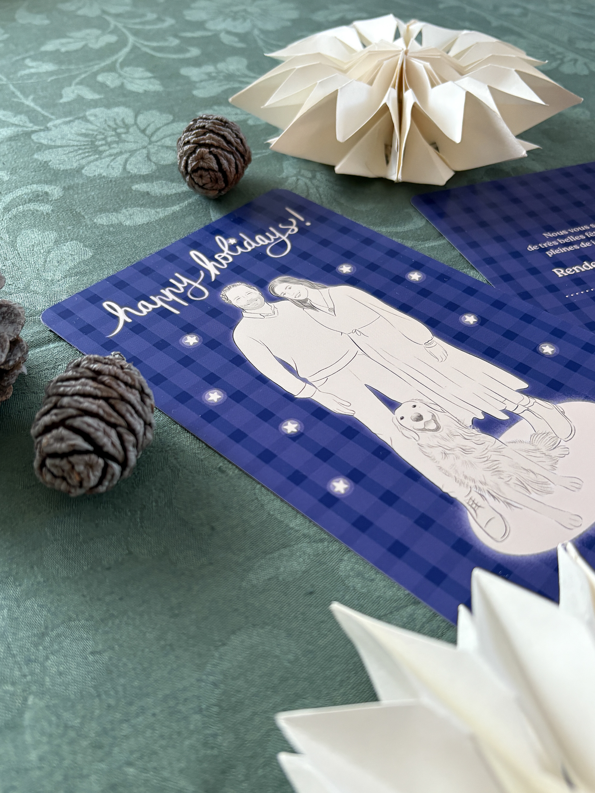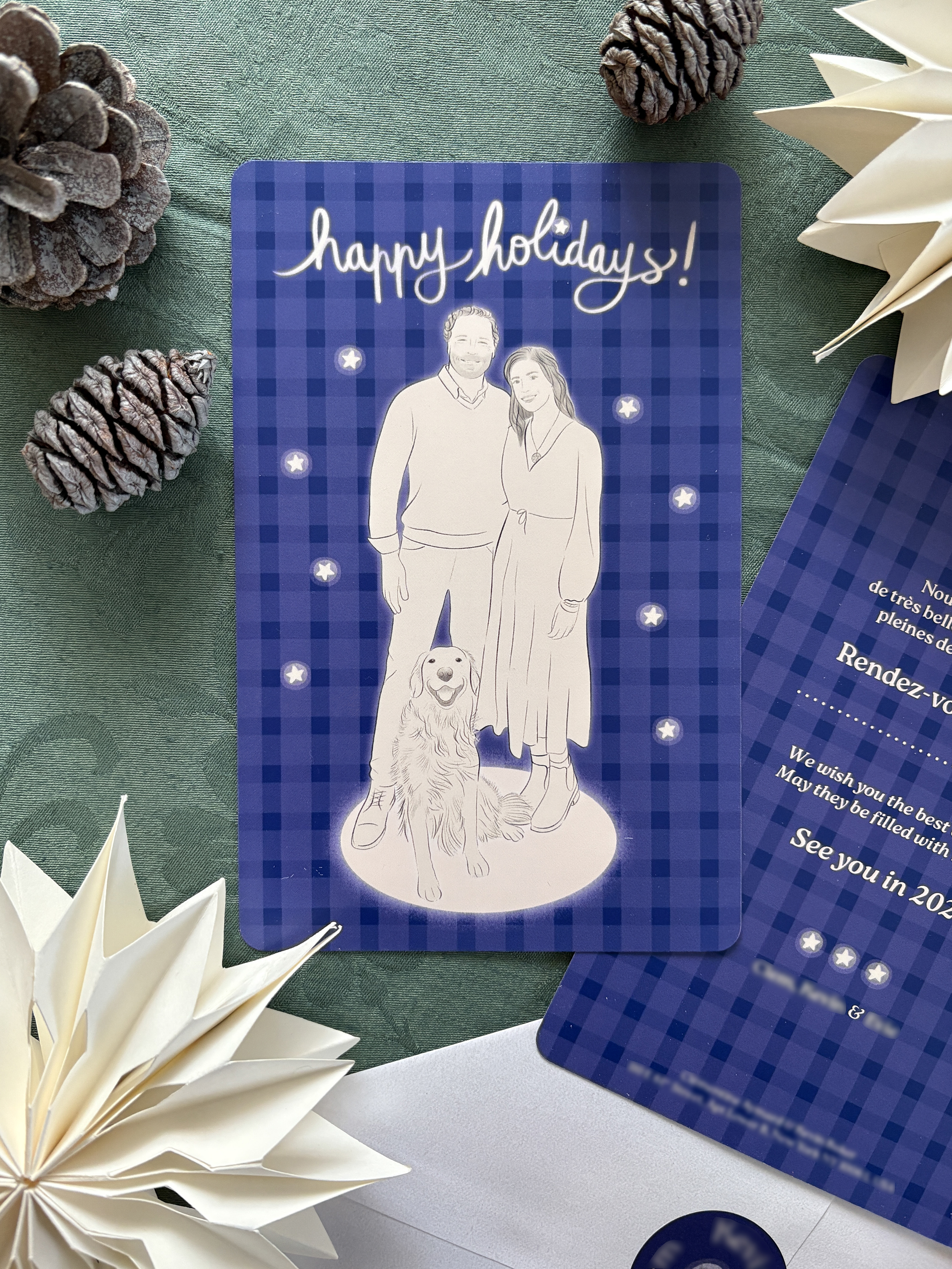 Ici les clients ont choisi le modèle de carte de vœux personnalisable que je proposais pendant la période des fêtes 2025. Le principe consistait à intégrer un portrait illustré de la famille sur un fond tartan.